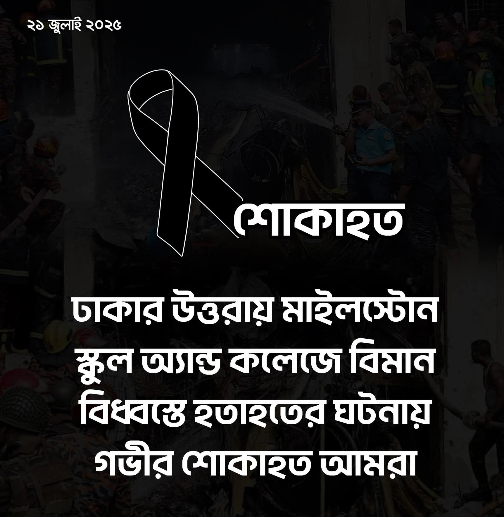 শিরোনাম : উত্তরা মাইলস্টোন স্কুল এন্ড কলেজে বিমান দুর্ঘট আহত দের জন্য , আমরা সবাই মিলে নিহতদের আত্মার শান্তি কামনা করি এবং আহতদের সুস্থতার জন্য প্রার্থনা করি।